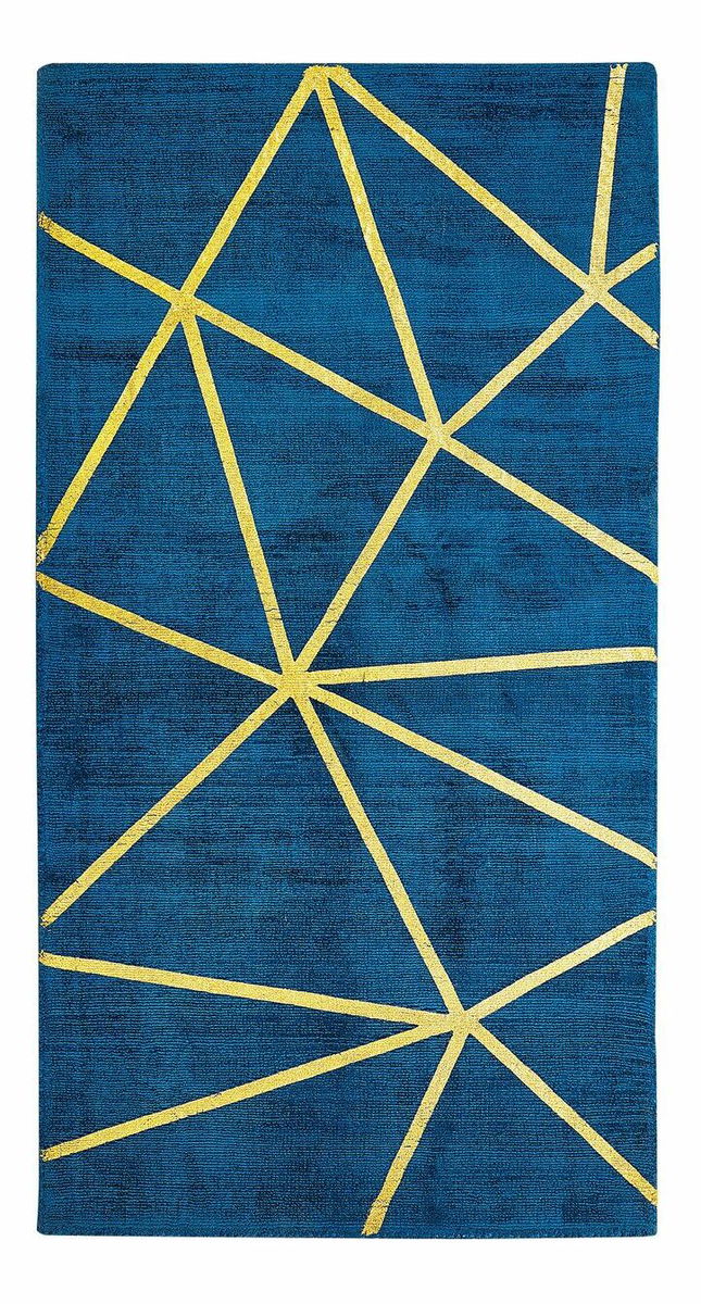 Ozdobte svůj obývací pokoj nebo ložnici tímto moderním kobercem. Jedinečný geometrický vzor ve zlaté barvě s ozdobným popraskaným efektem dokonale kontrastuje s tmavomodrým pozadím a každé místnosti dodá nádech luxusu a útulnosti. Koberec je vyroben z vysoce kvalitní viskózy a bavlny, je odolný a bude vám sloužit léta.