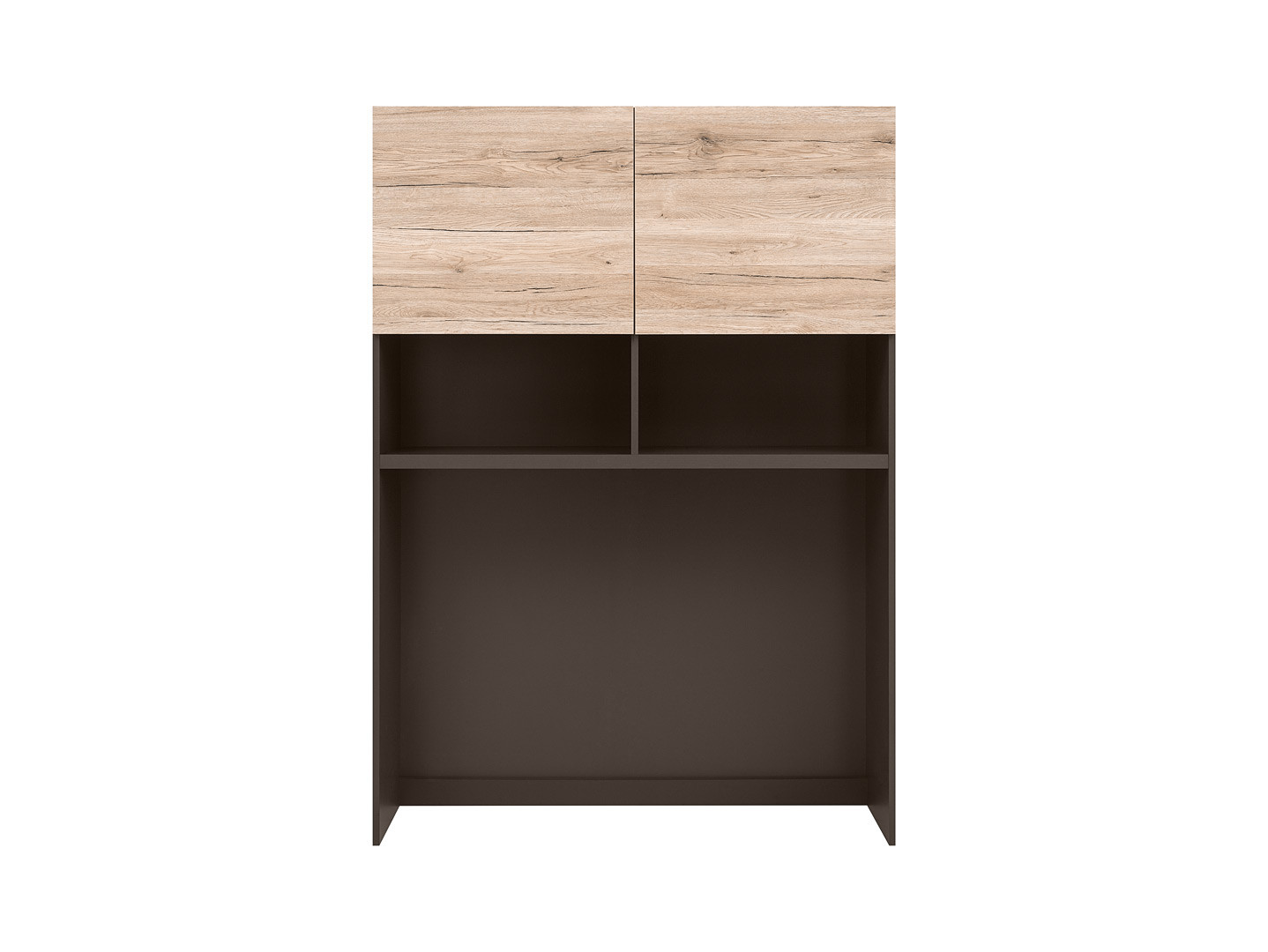Vhodným doplňkem do obývacích pokojů je tato nadstavba, která má poličku rozdělenou příčkou na dvě menší otevřené poličky. Ve vrchní části se nacházejí dvoje dvířka. Uvnitř se nacházejí čtyři menší poličky. Pokud potřebujete úložný prostor pro knihy, dekorace nebo jakékoliv doplňky, tato nástavba bude pro vás vhodná.