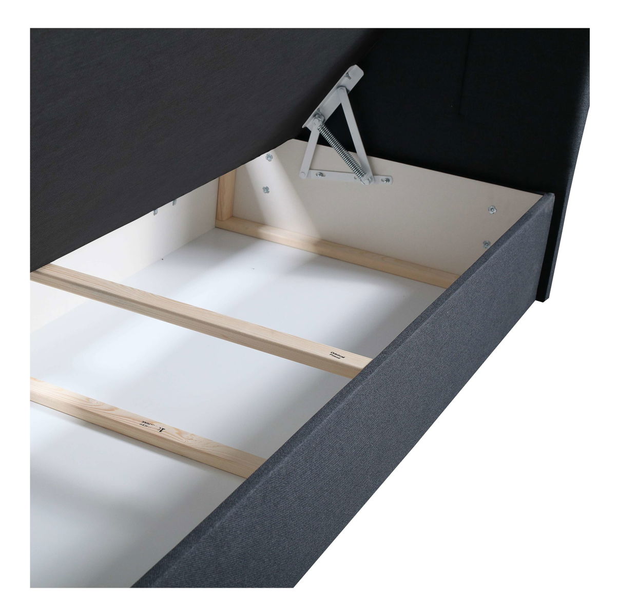 S úložným prostorem, S vysokým čelem, Dodáváno s matrací z bonelových pružin, Dodáváno s vrchním toperem, Pevná spodní dřevěná konstrukce, čalouněná látkou, Snímatelný potah
