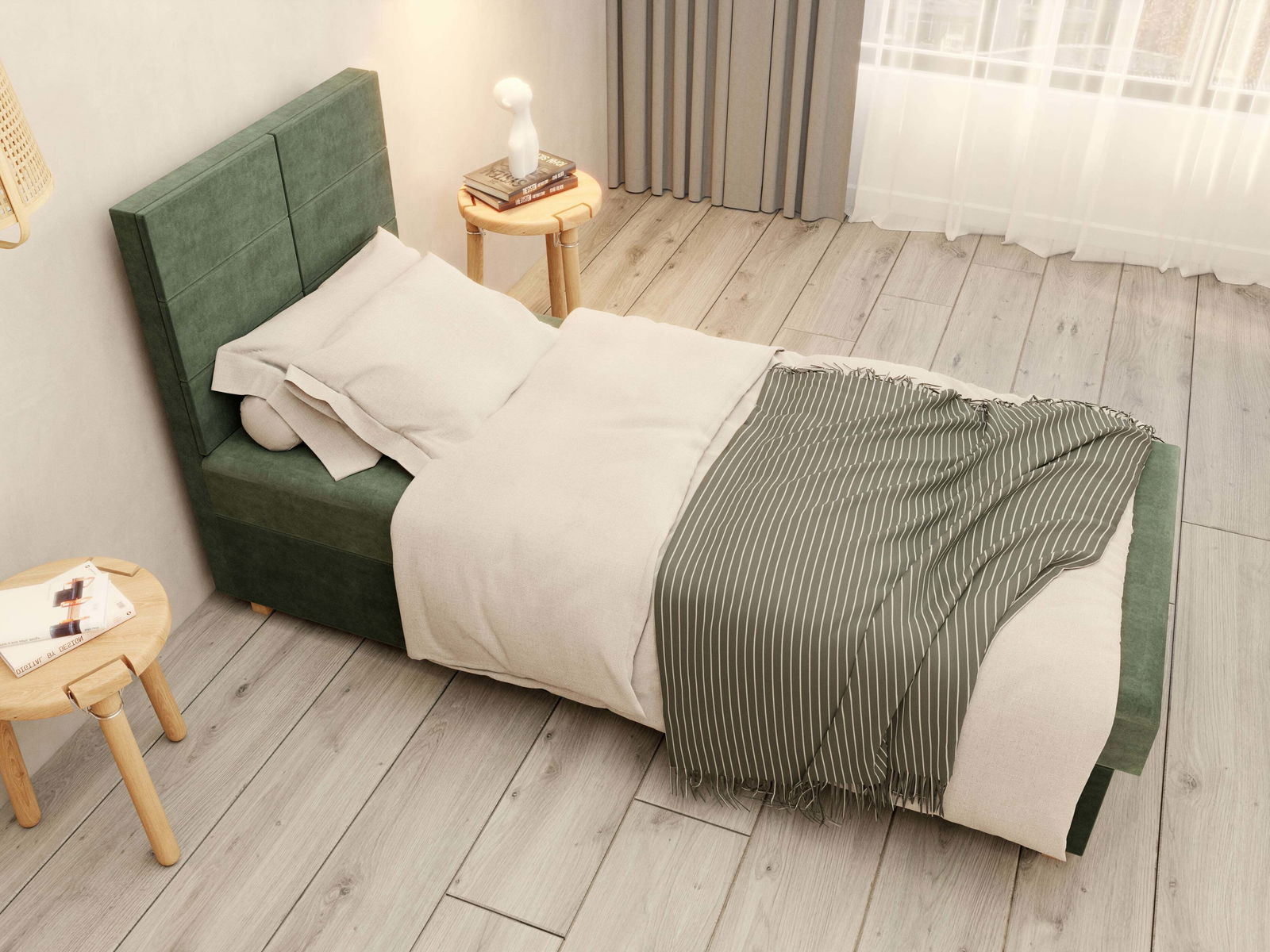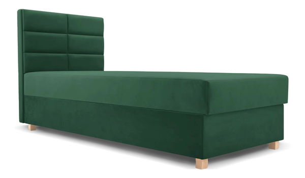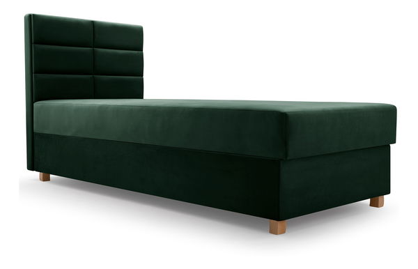 Moderní jednolůžková postel 80 cm - Picasso I (tmavě zelená) s úl. prostorem a matrací je ideální volba pro současné interiéry. Je vyrobena z masivního dřeva a dřevotřísky, což zaručuje pevnost a stabilitu. Čelo postele je elegantně prošívané, dodává v rámci postele sofistikovaný vzhled. S praktickým úložným prostorem a liftovým mechanismem, lze snadno přistupovat k uloženým věcem, což šetří místo v místnosti. Matrace s tloušťkou drátu 2,4 mm a 3 cm silnou pěnou T 30 poskytuje pohodlný spánek. Nožičky ze dřeva zajišťují stabilní podporu a moderní vzhled. S rozmoři 82x186 cm nabízí dostatek prostoru pro jednoosobové využití. Výška od země po vrch matrace je 46 cm, což umožňuje snadné vstávání. Postel je potažena měkkou tkaninou Bluvel, která dodává rámci luxusní pocit.