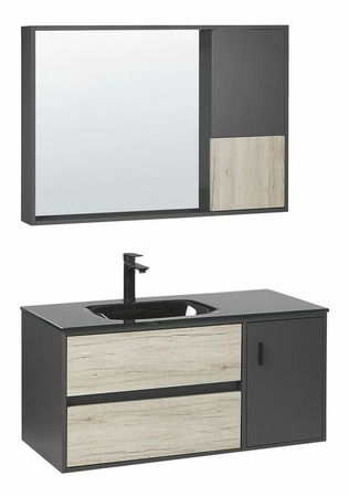 Díky této sadě nábytku do koupelny budete mít ve vaší koupelně dostatek úložného prostoru. Souprava sestává z umyvadlové skříňky a nástěnné skříňky se zrcadlem.