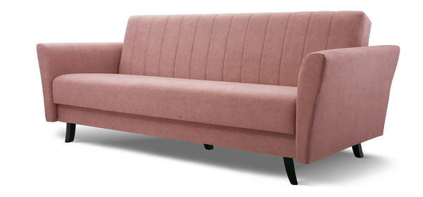 Pohovka trojsedačka - Linear (růžová) má výšku 90 cm, šířku 227 cm a hloubku 93 cm. Tato sedačka v retro stylu dokonale kombinuje tradiční design s moderními prvky. Její rám je vyroben z masivního dřeva a dřevotřísky, což zajišťuje její dlouhodobou odolnost a stabilitu. Sedák a opěradlo jsou vybaveny bonellovou pružinou o tloušťce drátu 2,4 mm a 3 cm silnou pěnou T 30, což poskytuje vynikající komfort při sezení. Sedačka má také praktický rozkládací mechanismus typu KLIK-KLAK, který umožňuje snadné přeměnění na plochu na spaní o rozměrech 118x195 cm. Může sloužit jako ideální řešení pro hosty nebo jako nouzové lůžko. Kromě toho má sedačka i úložný prostor pro uložení ložního prádla nebo jiných potřebných věcí. Je vhodná pro umístění i ve středu místnosti, protože její zadní strana je potažena stejnou látkou jako přední část. Sedačka poskytuje dostatek prostoru pro pohodlné sezení a je podepřena černými dřevěnými nožičkami o výšce 15 cm, které zvyšují její eleganci a usnadňují čištění prostoru pod ní.