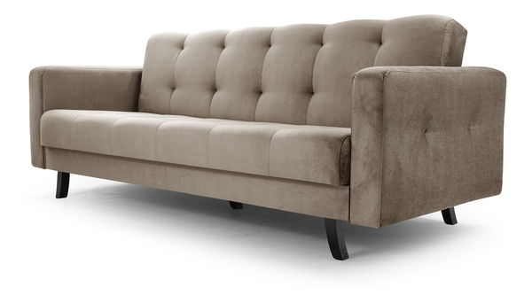 Pohovka trojsedačka - Lisabona (béžová) je vysoká 90 cm, široká 227 cm a má hloubku 93 cm. Tato trojsedačka v retro stylu spojuje historický vzhled s moderní funkčností. Její rám je vyroben z kombinace masivního dřeva a dřevotřísky, což zajišťuje její pevnost a stabilitu. Sedák a opěradlo obsahují bonellovou pružinu o tloušťce drátu 2,4 mm a 2 cm silnou pěnou T 30, což zaručuje pohodlí a podporu při sezení. Sedačka má rozkládací mechanismus typu KLIK-KLAK, který umožňuje snadné přeměnění na plochu na spaní o rozměrech 118x195 cm. Tento typ rozkladu je ideální pro multifunkční využití v menších prostorách. Sedačka také nabízí praktický úložný prostor, což je výhodné pro ukládání ložního prádla nebo jiných předmětů. Zadní strana sedačky je potažena stejnou látkou jako přední, což umožňuje její umístění kdekoli v místnosti. Jako třímístná sedačka poskytuje dostatek prostoru pro pohodlné sezení více osob. Je opřena o černé dřevěné nožičky o výšce 15 cm, což dodává sedačce jemný vzdušný vzhled a zároveň umožňuje snadné čištění pod ní.
