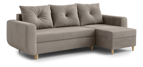 ZobrazitPravá rohová sedačka Eugenie představuje harmonii stylu a komfortu. Solidní konstrukce je vytvořena ze dřeva a 18 mm nábytkové desky, zatímco výplně z bonellových pružin a pěny T 30 zajišťují pohodlí. Esteticky příjemné naturální dřevěné nožičky mají výšku 10 cm a elegantní opěrky na ruce měří 56x20x88 cm. Úložný prostor a trio podušek přidávají na funkcionalitě, zatímco plocha na spaní 200x140 cm zajišťuje klidný odpočinek.