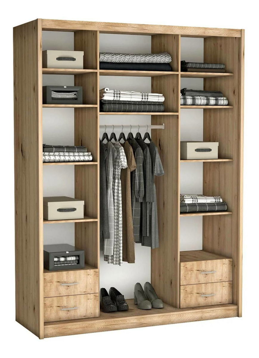 ZobrazitVelká a prostorná šatní skříň s posuvnými dveřmi a zrcadlem na jedné straně. Díky velkému počtu polic a šuplíků si můžeme lépe zorganizovat oblečení a další věci. Ve středu se nachází tyč a dvě širší police. Je vytvořena z nejkvalitnějších materiálů, je stabilní, jednoduchá a vyplní prázdný prostor. Přírodní odstíny zaručují, že se hodí do každého prostoru.