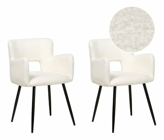 Tato sada židlí je ztělesněním moderního designu. Představuje kombinaci retro siluety, funkčnosti, kvalitních materiálů a pohodlí. Čalouněná sedadla jsou doplněna opěrkami na ruce a opěradly s netradičním výřezem. Stylové buklé čalounění je doplněno tenkými, mírně zešikmeným černýma nohama. Díky svému univerzálnímu designu budou tyto židle vypadat skvěle u jídelního stolu, v domácí kanceláři nebo v ložnici.