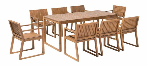 S touto zahradní soupravou dřevěného nábytku můžete vytvořit stylové místo pro setkání s přáteli a rodinou. Souprava je vyrobena z odolného akáciového dřeva a díky modernímu lamelovému designu doplní jakýkoli vnější prostor. Stůl s jednoduchými liniemi nabízí místo ke stolování pro 8 osob a židle se širokými sedadly a područkami zaručují příjemný komfort během sezení.