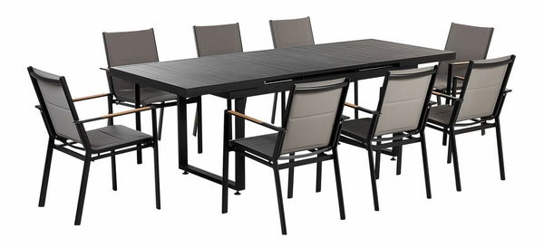 Připravte zahradu nebo terasu na setkání s rodinou a přáteli pomocí této zahradní soupravy. Sestává z rozkládacího stolu a 8 židlí s měkkými sedadly a opěradly, které doplňují elegantní a zároveň minimalistický design stolu. Konstrukce je vyrobena z hliníku, takže sestavu lze bez obav používat v exteriéru. Dokonale zapadne do většího vnějšího prostoru a dodá mu moderní šmrnc.