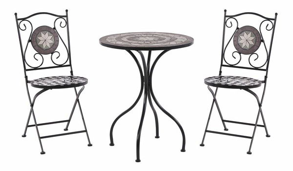 Vychutnejte si šálek čaje na čerstvém vzduchu s touto okouzlující bistro soupravou. Je ideální do malých i velkých prostor a má zajímavý mozaikový vzor vyrobený z keramických dlaždic. Vytvořte si útulný koutek na dvoře nebo balkoně, kde budete moci nerušeně odpočívat. Soupravě vyrobené z kovu neublíží ani déšť a díky skládacím židlím se snadno skladuje.