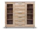 Praktická třídílná vitrína s různými možnostmi uložení Vašich věcí. Po stranách jsou prosklené části s poličkami pro umístění předmětů, které chcete aby byly viditelné. Ve středu se nacházejí čtyři zásuvky a v horní části barová skříňka s výklopnými dvířky.