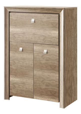 Barová skříňka s vyklápěcími dvířky, za nimiž je skleněná polička. V dolní části je prostor s jednou poličkou, který je uzavřen dvěma dvířky. Pěkné vlnovkové úchyty dotvářejí celkový design nábytku. Netradiční barevné provedení dřeva san remo mu dodává jedinečnost.