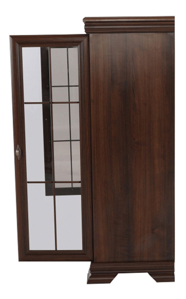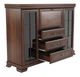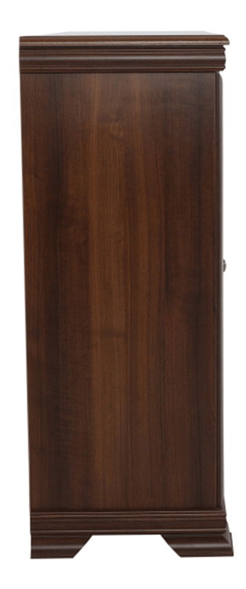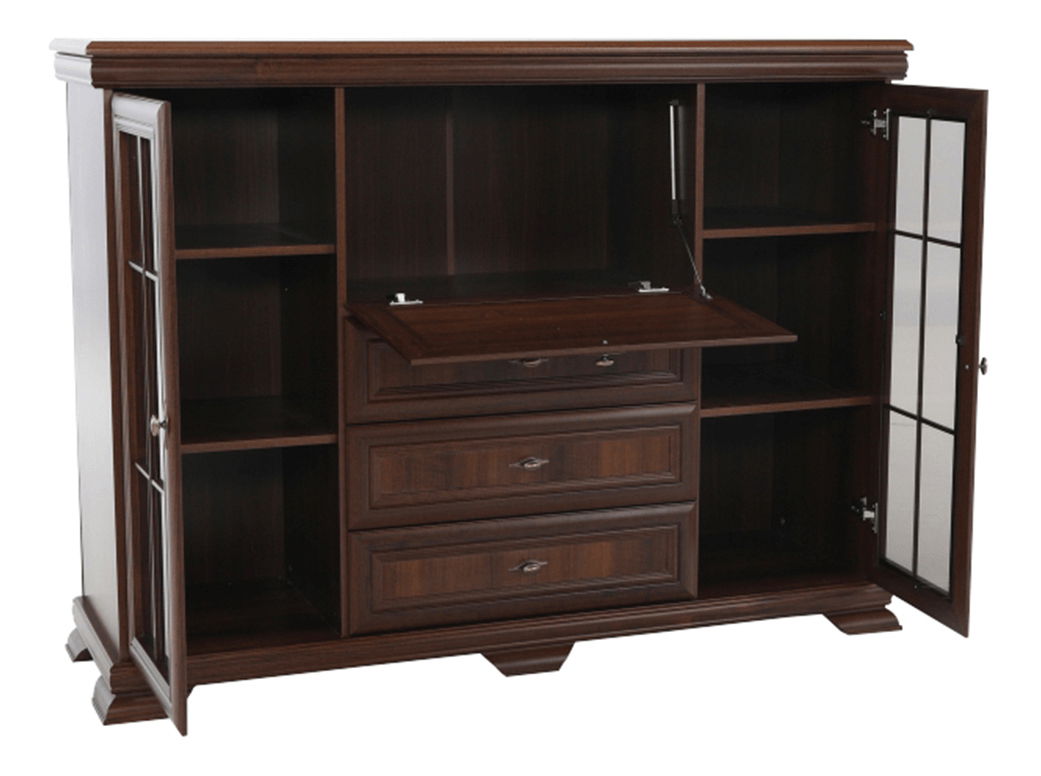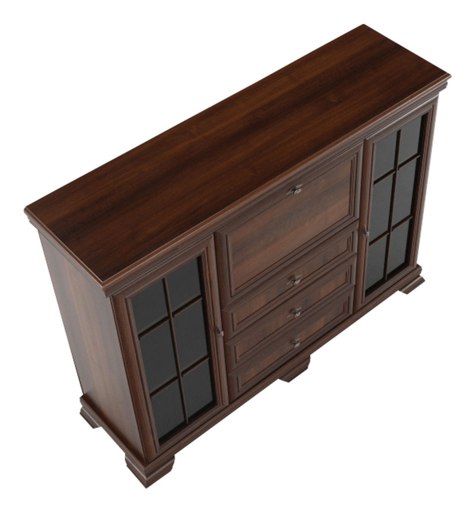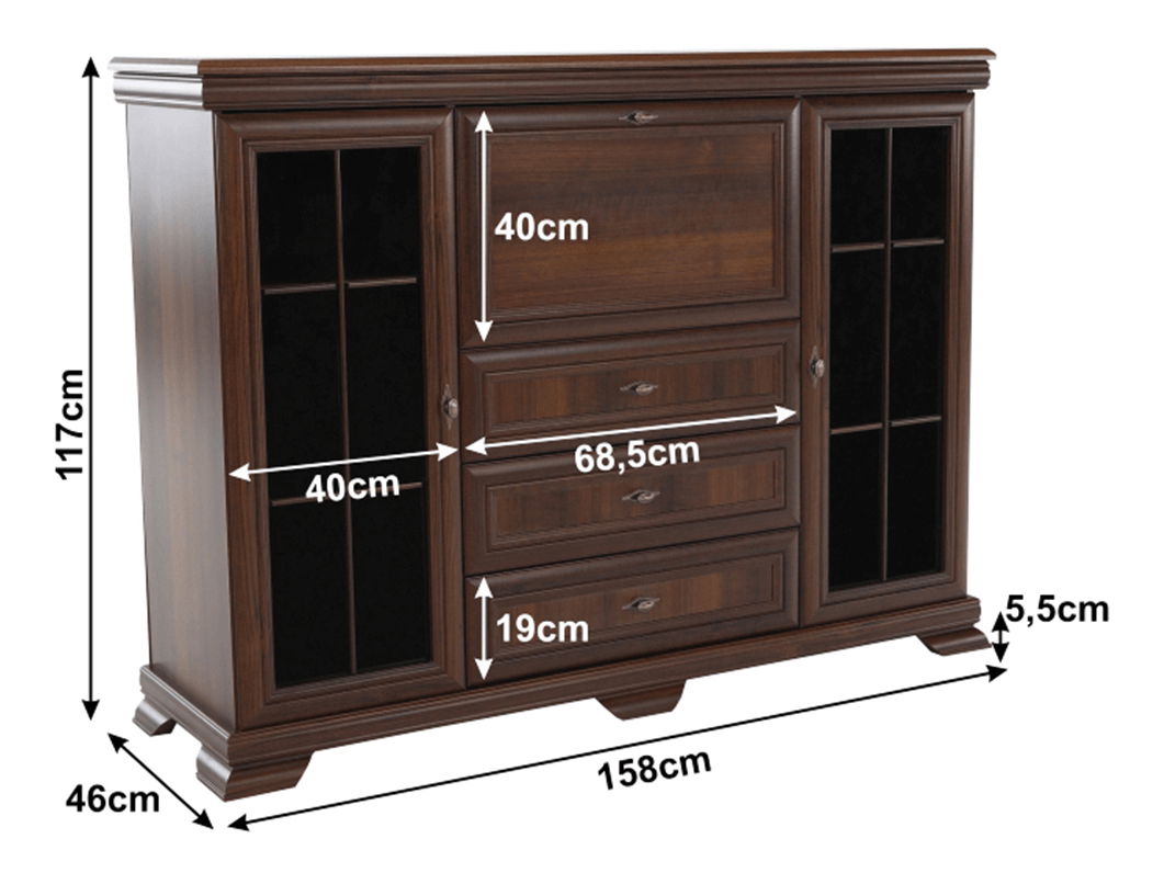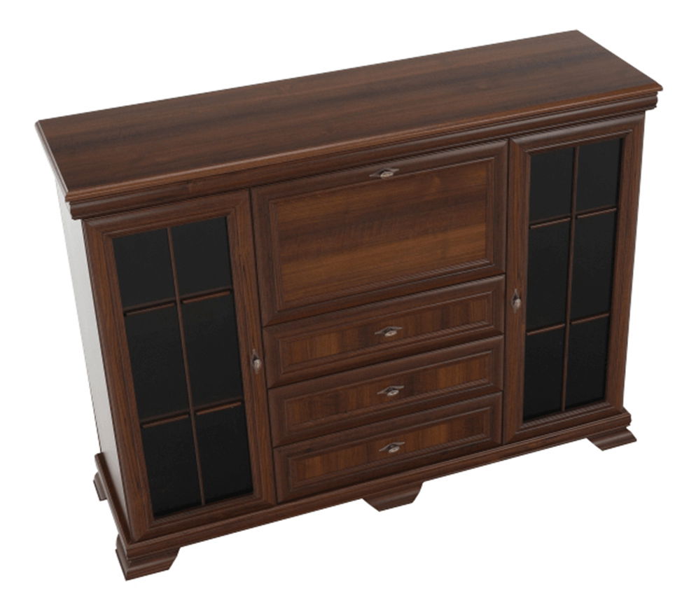 Elegantní masivní komoda Kraz s prosklenými dvířky, třemi zásuvkami a výklopnou částí. Rustikální styl komody vystihují ozdobné vyřezávané nohy a lišty. Zásuvky a dvířka mají kovové úchyty. Bude se vyjímat v obývacích pokojích, jídelnách a pracovnách. Komoda je v pěkném tmavém provedení Samoa king.