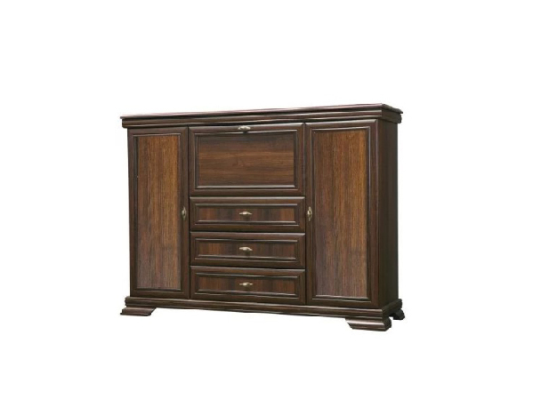 Elegantní masivní komoda Kora s plnými dvířky, třemi zásuvkami a výklopnou částí. Rustikální styl komody vystihují ozdobné vyřezávané nohy a lišty. Zásuvky a dvířka mají kovové úchyty. Bude se vyjímat v obývacích pokojích, jídelnách a pracovnách. Komoda je v pěkném tmavém provedení Samoa king.