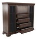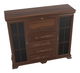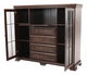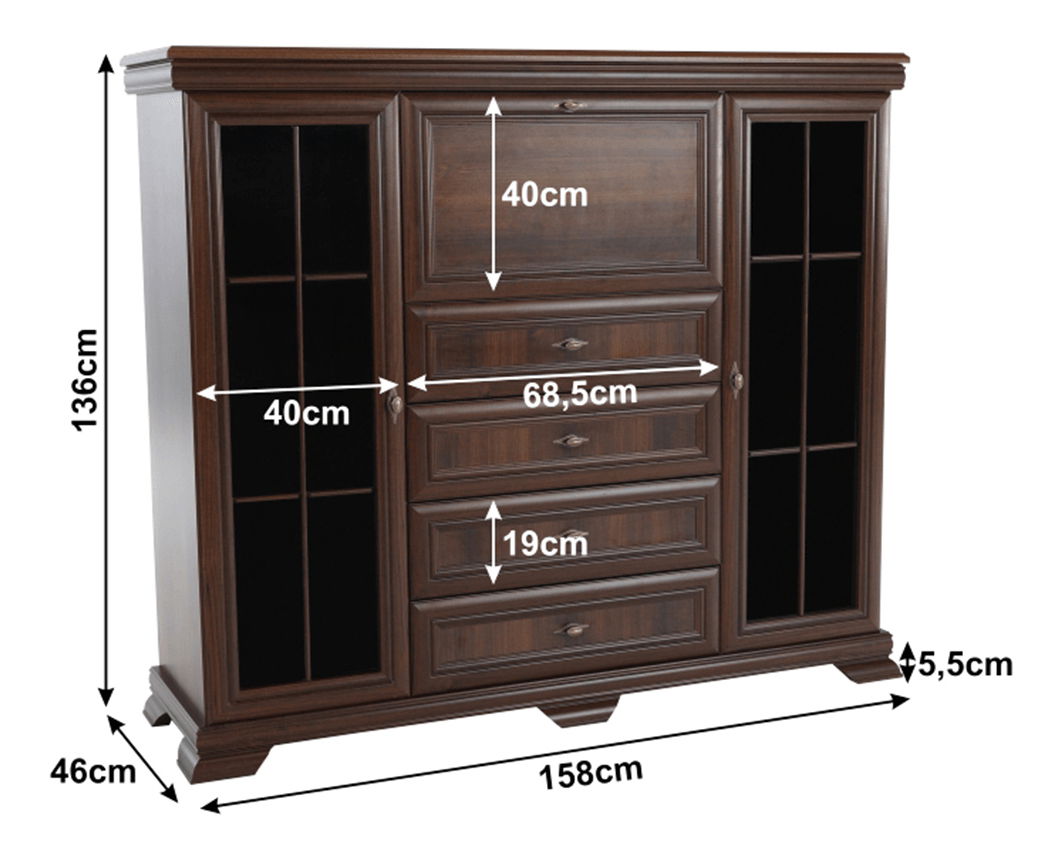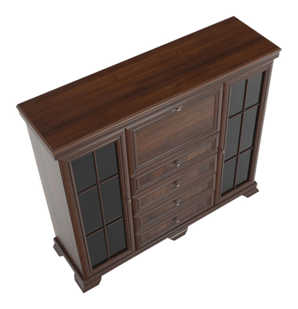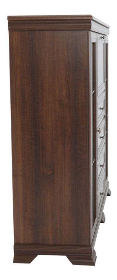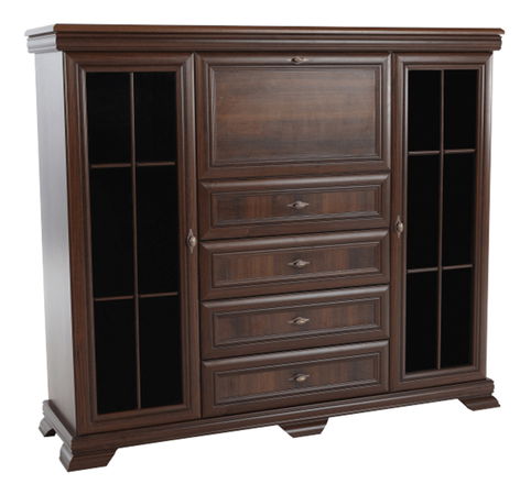 Krásná dvoudveřová komoda Kraz s prosklenými dvířky, čtyřmi zásuvkami a výklopnou barovou skříňkou. Elegantní rustikální styl komody zkrášlí vaše obýváku, jídelny či pracovny. Má ozdobné vyřezávané nohy a lišty. Úchyty na dvířkách a zásuvkách jsou kovové. Barevné provedení komody je Samoa king.