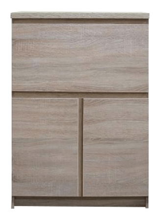 Barová skříňka Punkto Typ 12 3D o výšce 125 cm, šířce 83 cm a hloubce 41 cm je vyrobena z kvalitní DTD laminované desky s ABS hranami pro dlouhou životnost. Skříňka obsahuje horní výklopná dvířka a dvě dvířka na spodní části. Barevná kombinace dubu sonoma s moderním bezúchytovým otevíráním dodává luxusní pocit do místnosti. Skříňka se dodává v demontu.