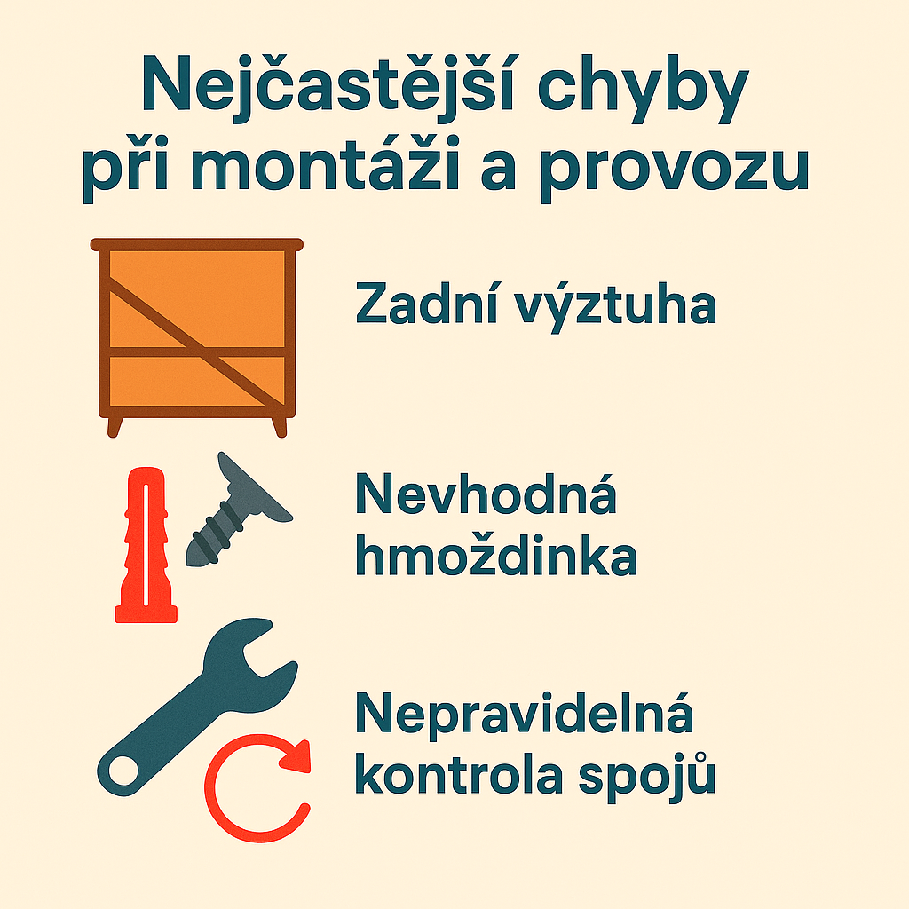 Nikdy nevynechávejte zadní křížovou výztuhu, protože právě ta drží korpus v pravém úhlu a zabraňuje jeho rozklesnutí při bočním nárazu. Pokud musíte kotvit do dutých stěn, použijte kovové rozpěrné hmoždinky M6; běžné plastové rozpěry se ze sádrokartonu vytrhnou již při zatížení 60 N. Stejně důležité je jednou do roka dotáhnout všechny šrouby a panty, neboť i jediný milimetr vůle může snížit nosnost excentrového spoje o pětinu.