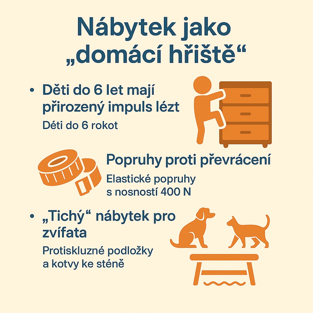 Komody vyšší než 76 cm musí být ukotveny ke stěně a opatřeny zarážkami proti vysunutí několika zásuvek najednou, jinak se nábytek při lezení dítěte snadno převrátí. Pružné popruhy proti převrácení udržujte stále napnuté; pravidelně kontrolujte, zda mezi popruhem a stěnou nejsou více než tři milimetry vůle. Lehké stoly a skříňky, do kterých může pes nebo kočka narazit, umístěte na protiskluzové podložky, aby zůstaly stabilní i při nárazu silou přibližně 30 N.