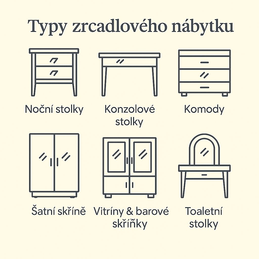 Zrcadlový nábytek přináší do interiéru jedinečnou kombinaci funkčních výhod a estetického půvabu . Z hlediska praktického dokáže rozjasnit tmavé kouty a opticky zvětšit prostor, čímž zlepšuje využití světla v domácnosti a zvyšuje pocit pohodlí (Peña-García, 2022; Jaglarz, 2011). Po vizuální stránce zase vnáší do místnosti efekt hloubky, perspektivy a luxusu – odrazy vytvářejí zajímavé pohledy a lesk zrcadel dodává šmrnc různým stylům od moderního minimalismu po glamour či art deco. Správně zvolený zrcadlový kousek může fungovat jako dekorace sám o sobě , přitom však plní i běžnou úlohu nábytku (ať už je to uložení věcí, nebo odkládací plocha).