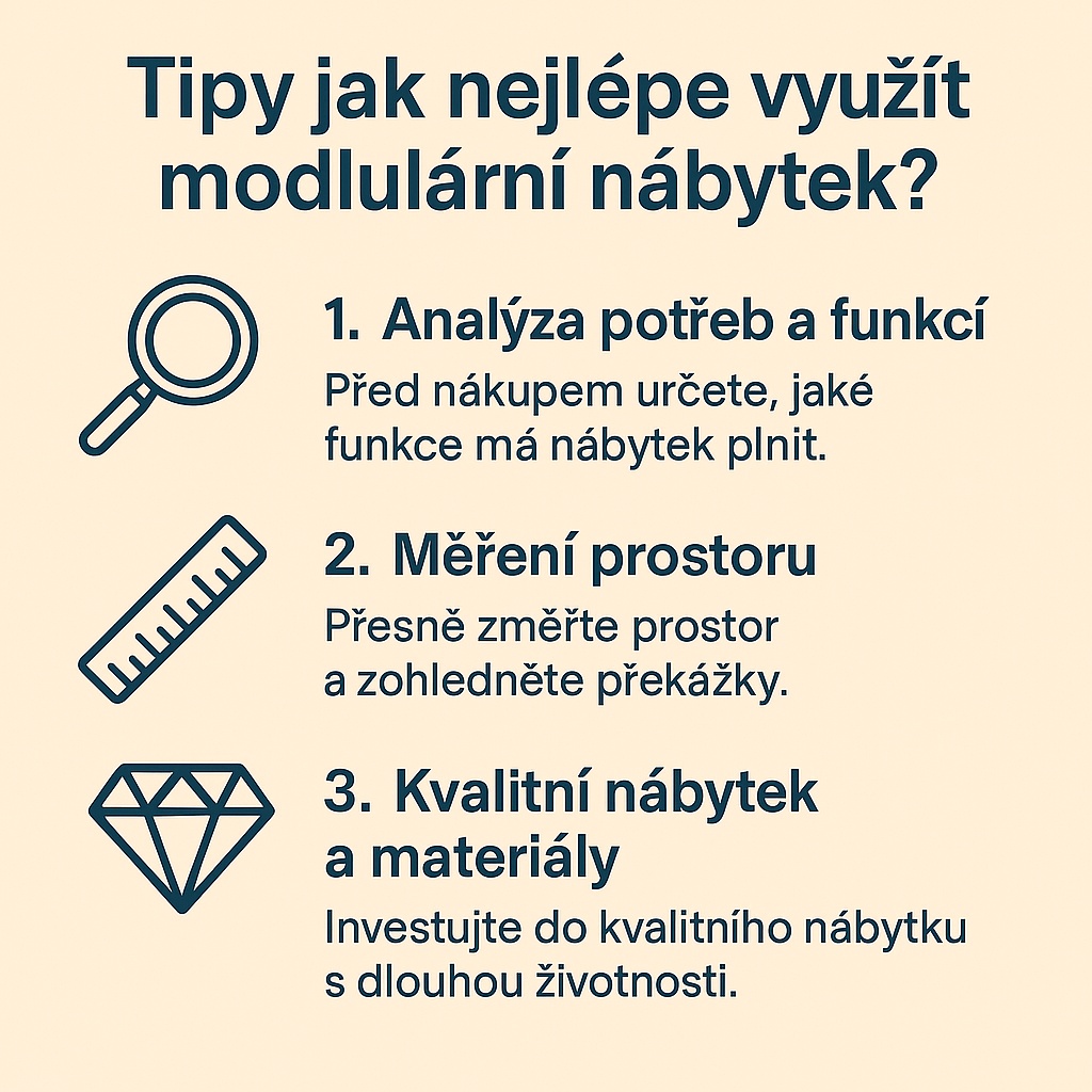 Tipy pro správný výběr : Při výběru modulárního nábytku si udělejte seznam všech požadavků, které musí nábytek splňovat (úložný prostor, velikost, variabilita). Následně porovnejte různé možnosti podle těchto kritérií a nezapomeňte zohlednit budoucí růst nebo změnu prostoru.