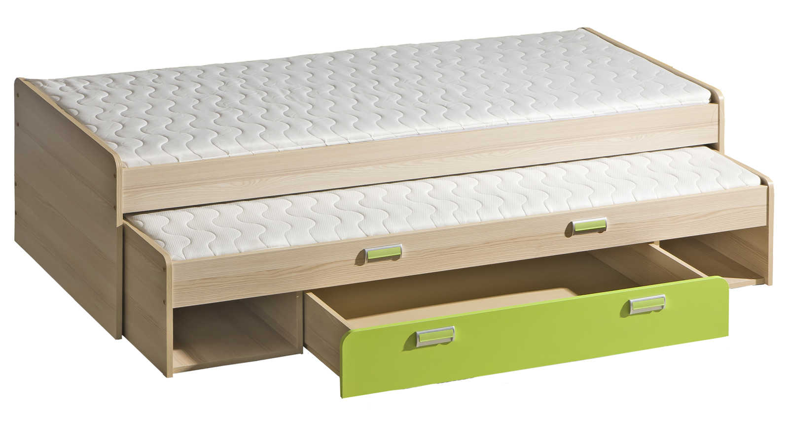 Rozkládací postel Ego se na první pohled zdá jako obyčejné jednolůžko, ale když je třeba, rázem se z ní stane plnohodnotné dvojlůžko určeny pro každodenní spaní. Postel díky kombinaci se zelenou barvou navíc působí neotřele a svěže. A protože jde o sektorový nábytek, ve stejném stylu si můžete zařídit celý pokoj.