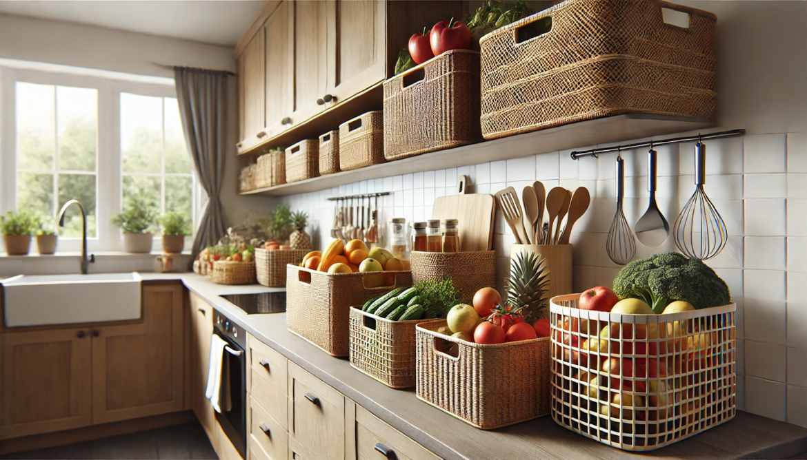 Proutěné koše: Koše z přírodních materiálů, jako je vrbové proutí, jsou pevné a odolné. Jsou ideální pro skladování ovoce, zeleniny nebo pečiva. Dodávají kuchyni rustikální vzhled.