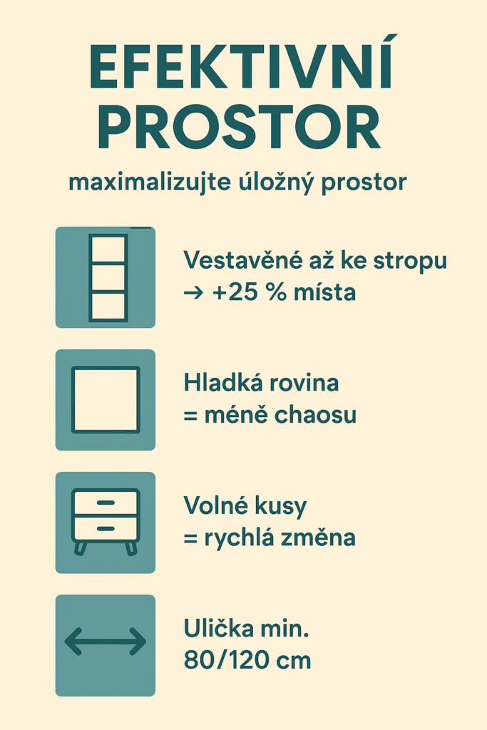 Vestavěná řešení dokáží využít centimetru, které volně stojícímu nábytku unikají – zapracují se do niky, obejdou šikminu pod střechou a sáhnou až po strop. Experimenty na katedře interiérové ergonomiky potvrdily, že vestavěná šatní skříň zvyšuje objem úložného prostoru v průměrné ložnici o 25 % oproti skříni se stejnou šířkou, ale bez přesného lícování se stropem (Kim & Lee, 2022). Ergonomicky se navíc eliminuje „vizuální šum“ – hladká čelní rovina usnadňuje orientaci i čištění. Volně stojící kusy však nabízejí cirkulační prostor : pokud potřebujete změnit dispozici, odsunete je a místnost získá novou funkci.