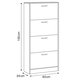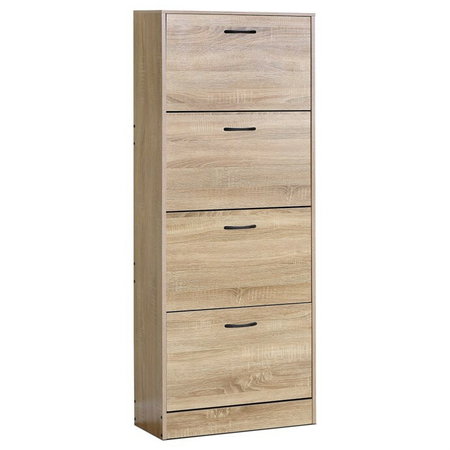 Botník se čtyřmi samostatnými přihrádkami nabízí praktické řešení pro uspořádání obuvi v předsíni nebo chodbě. Je vyroben z MDF desek s dekorativní povrchovou úpravou v odstínu dub, která věrně napodobuje strukturu dřeva a snadno se udržuje. Každá přihrádka je vybavena černou úzkou úchytkou pro pohodlné otevírání. Kompaktní tvar a vertikální uspořádání šetří místo a zároveň poskytuje dostatek úložného prostoru. Botník je stabilní a navržen pro dlouhou životnost v domácím prostředí.