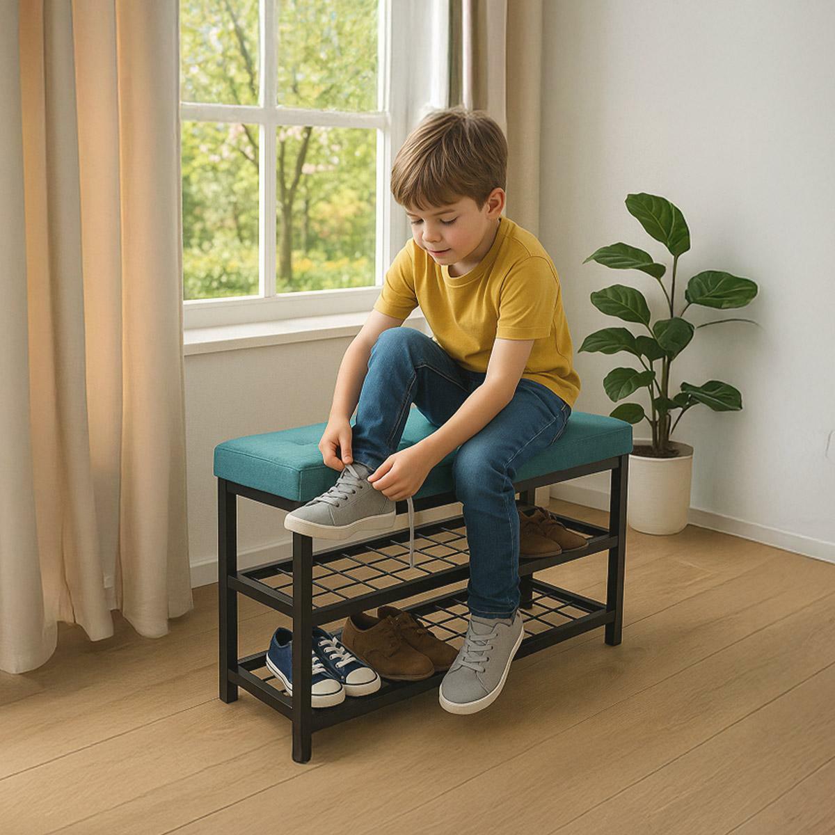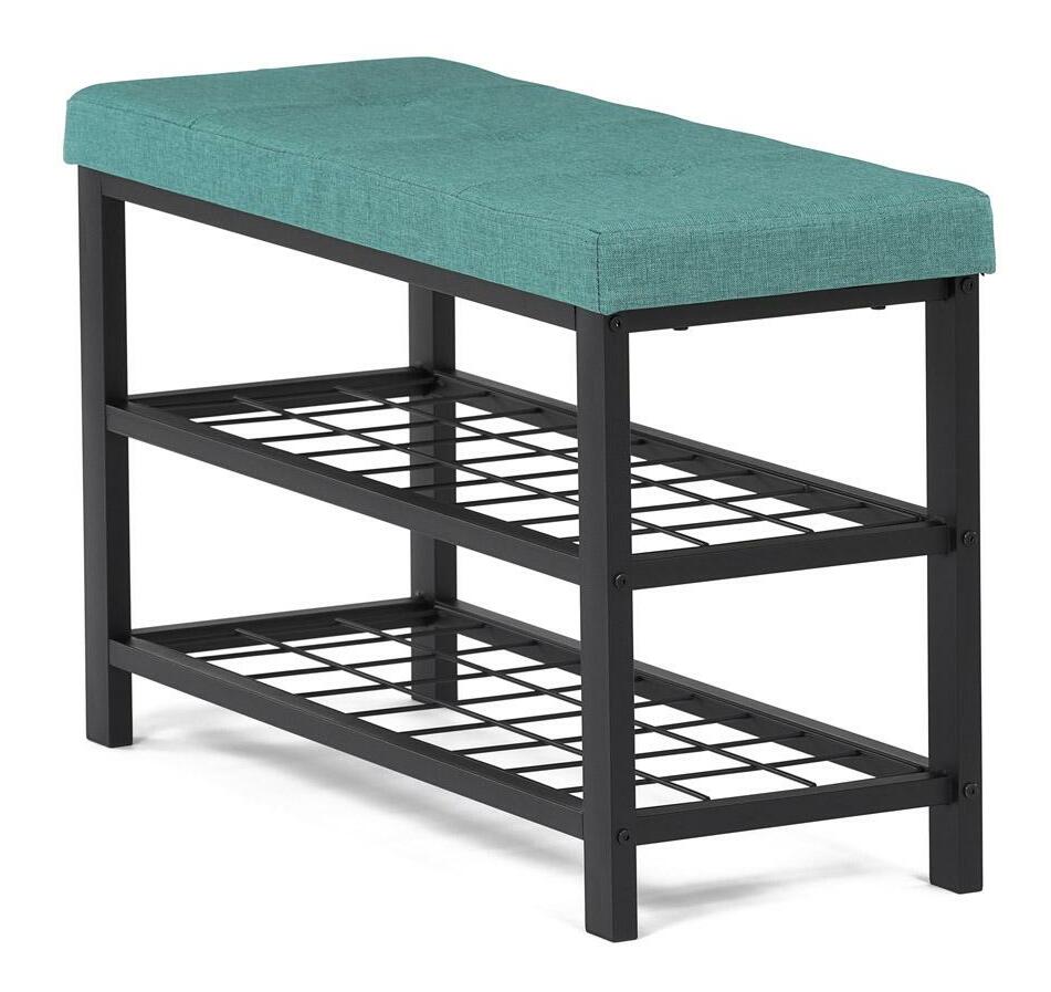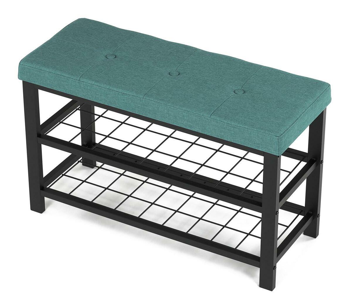 Stylový botník s lavicí přináší kombinaci pohodlí a praktičnosti. Zelené polstrované sedátko nabízí komfort při obouvání, zatímco dvě prostorné kovové police poskytují dostatek místa pro uskladnění obuvi. Stabilní konstrukce z kovu zajišťuje odolnost a dlouhou životnost. Elegantní design v neutrálních tónech snadno zapadne do moderních i tradičních interiérů. Tento botník je ideální volbou pro předsíně, kde pomůže udržet pořádek a zároveň přidá praktický sedací prvek.