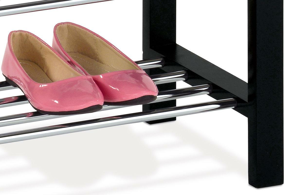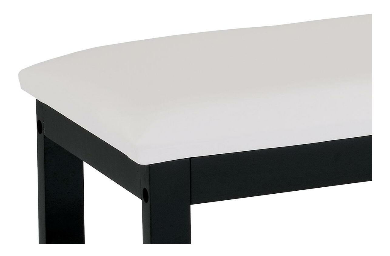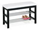 Praktický dřevěný botník se dvěma kovovými rošty, který zároveň slouží také jako sedací lavice. Díky svým rozměrům má ideální ložnou plochu pro uložení bot, ale prostorově se vejde i do menších síní. Měkký sedák je potažen bílou hladkou ekokůží, výplň je z PU pěny. Kostra botníku je z masivního kaučukovníkového dřeva v černém matném laku. Rošty jsou z kovových chromovaných trubek o průměru 12 mm. Nosnost k sezení je 90 kg, nosnost jednotlivých polic je 6 kg. Dodáváno v demontu. S tímto botníkem bude přezouvání vždy pohodlné a bezpečné.