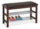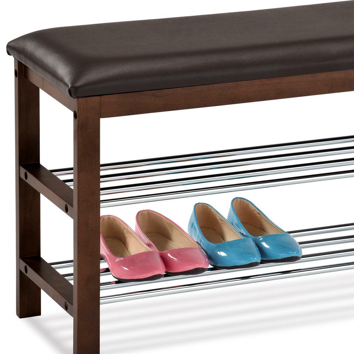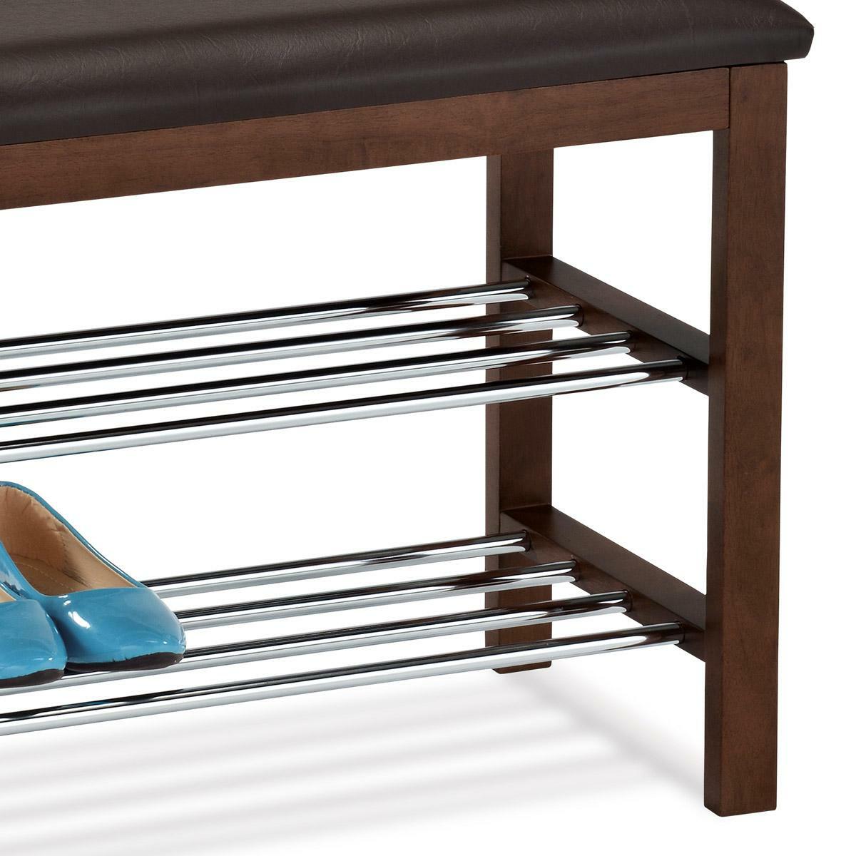Praktický dřevěný botník se dvěma kovovými rošty, který zároveň slouží také jako sedací lavice. Díky svým rozměrům má ideální ložnou plochu pro uložení bot, ale prostorově se vejde i do menších síní. Měkký sedák je potažen hnědou hladkou ekokůží, výplň je z PU pěny. Kostra botníku je z masivního kaučukovníkového dřeva, mořená v odstínu ořech. Rošty jsou z kovových chromovaných trubek o průměru 12 mm. Nosnost k sezení je 90 kg, nosnost jednotlivých polic je 6 kg. Dodáváno v demontu. S tímto botníkem bude přezouvání vždy pohodlné a bezpečné.