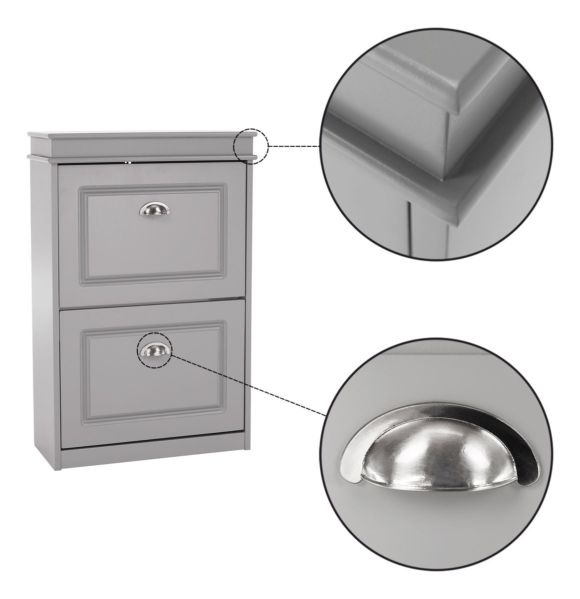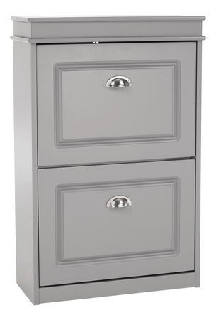 Rustikální botník Epery TYP 1 (šedá) o výšce 82,5 cm, šířce 53,5 cm a hloubce 24 cm má výrazný design s designovými úchyty. Poskytuje dostatek úložného prostoru s dvojicí výklopných zásuvek, které jsou vhodné pro 8 párů bot. Botník obsahuje 2 řady, má nosnost 45 kg a je vyroben z MDF/Dřevotříska. Produkt se dodává v demontu.