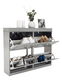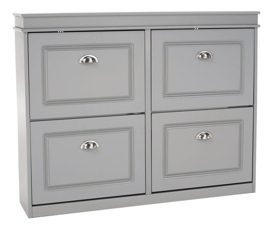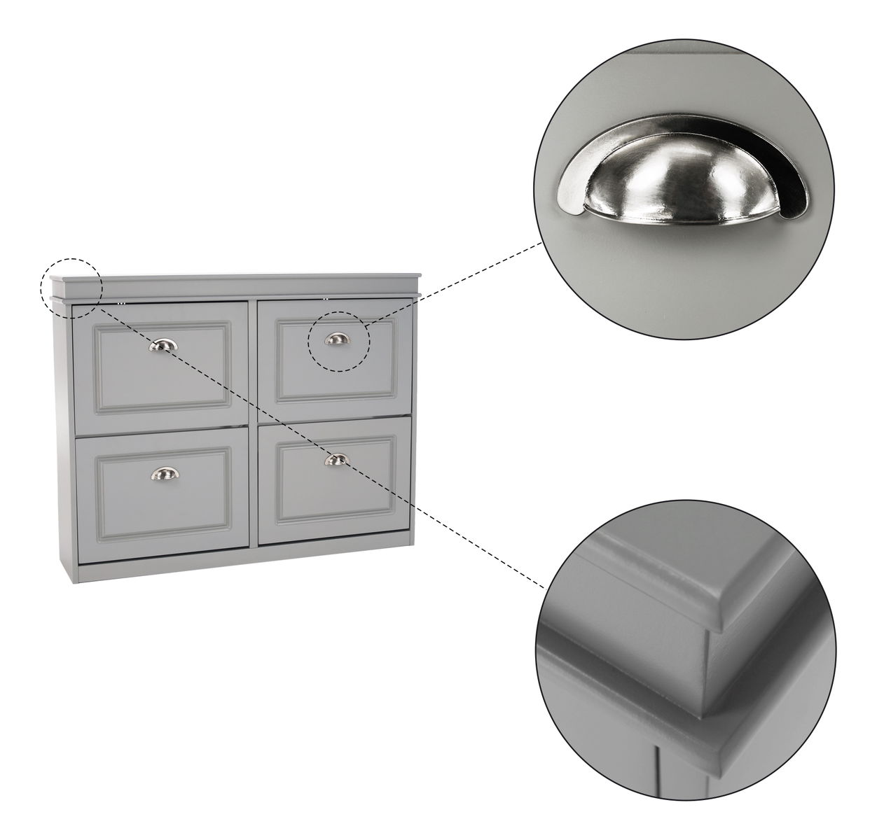 Botník Epery TYP 5 v šedé barvě je rustikálního designu s designovými úchyty. S výškou 81,5 cm, šířkou 104 cm a hloubkou 24 cm poskytuje dostatek úložného prostoru. Botník má čtyři výklopné zásuvky, které jsou vhodné pro 16 párů bot. Botník má dvě řady a nosnost 90 kg. Materiál je MDF/Dřevotříska a dodává se v demontu.