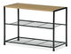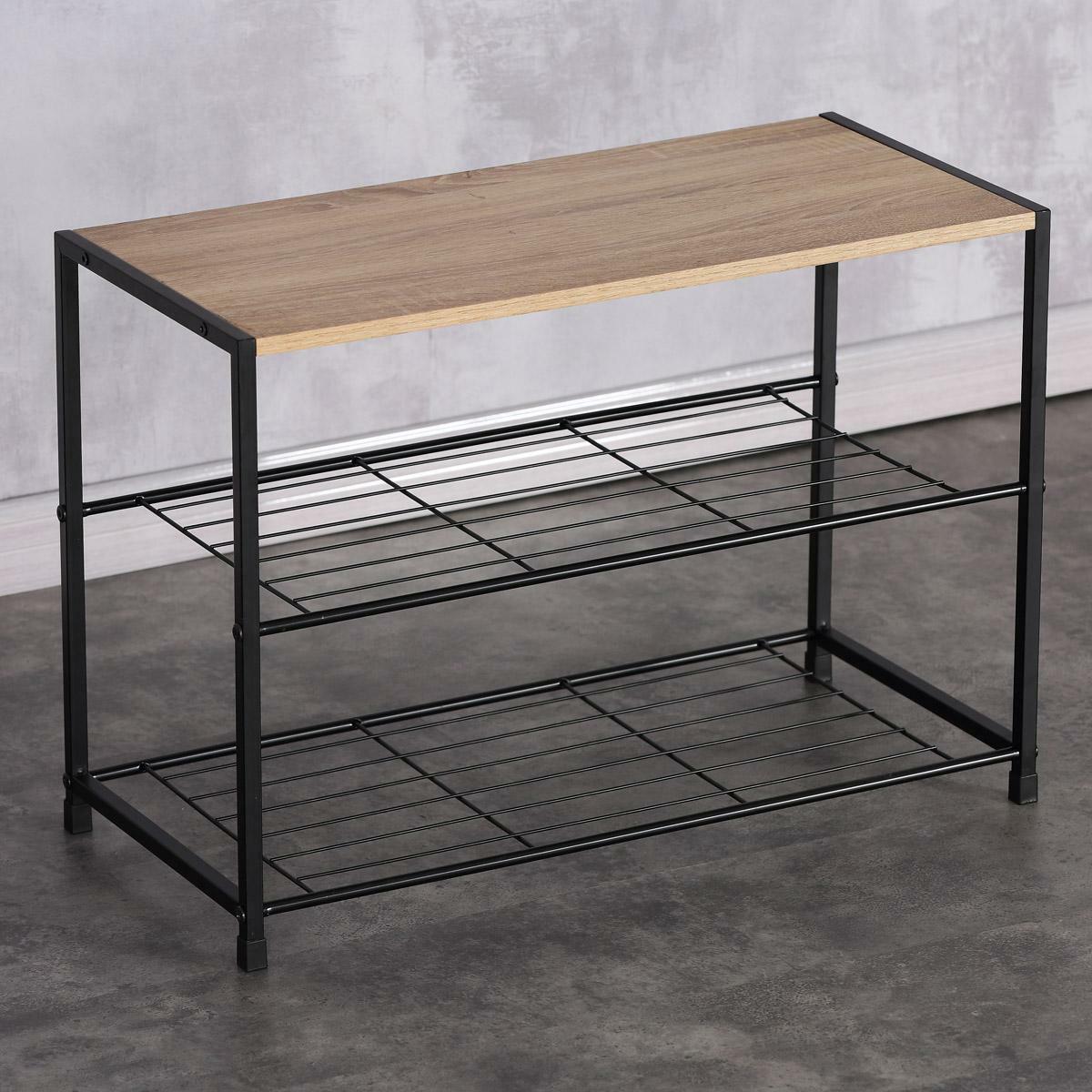 ZobrazitBotník s konstrukcí a odkládacími plochami z lehkého kovu v černé barvě. Půda je vyrobena z MDF desky s povrchovou úpravou 3D fólie v odstínu dub sonoma.