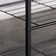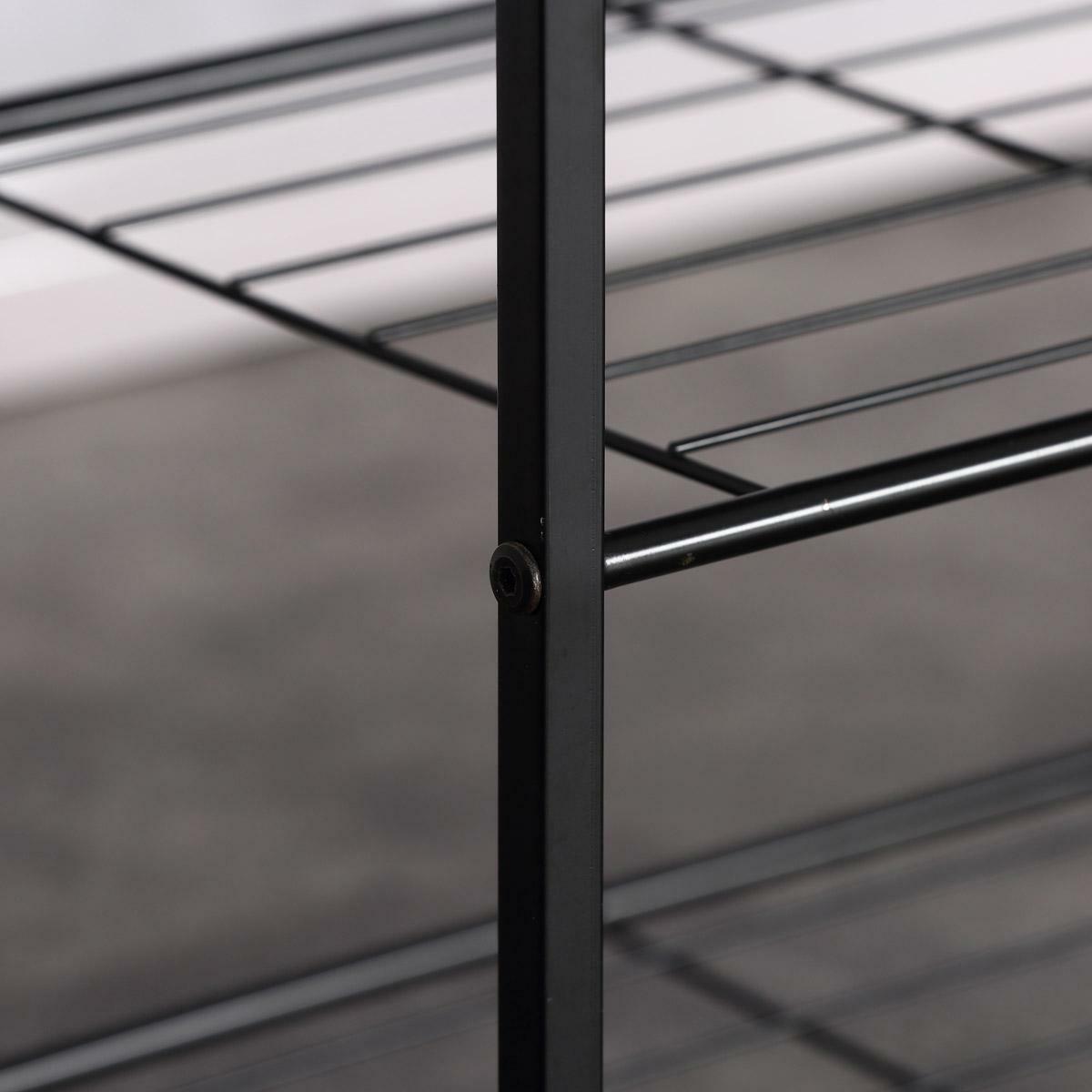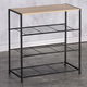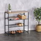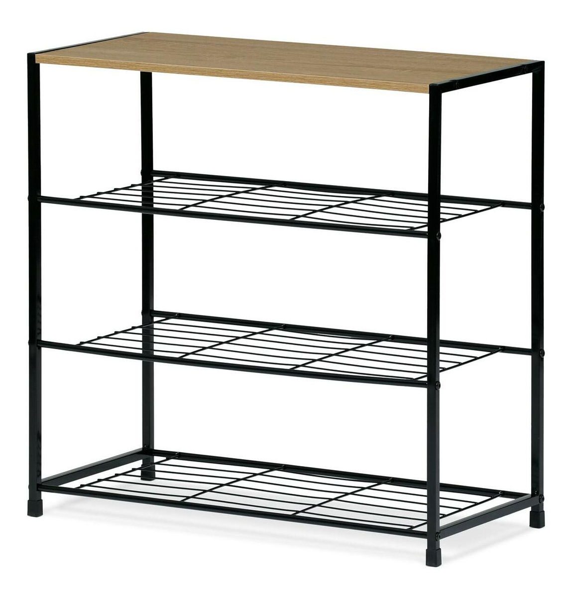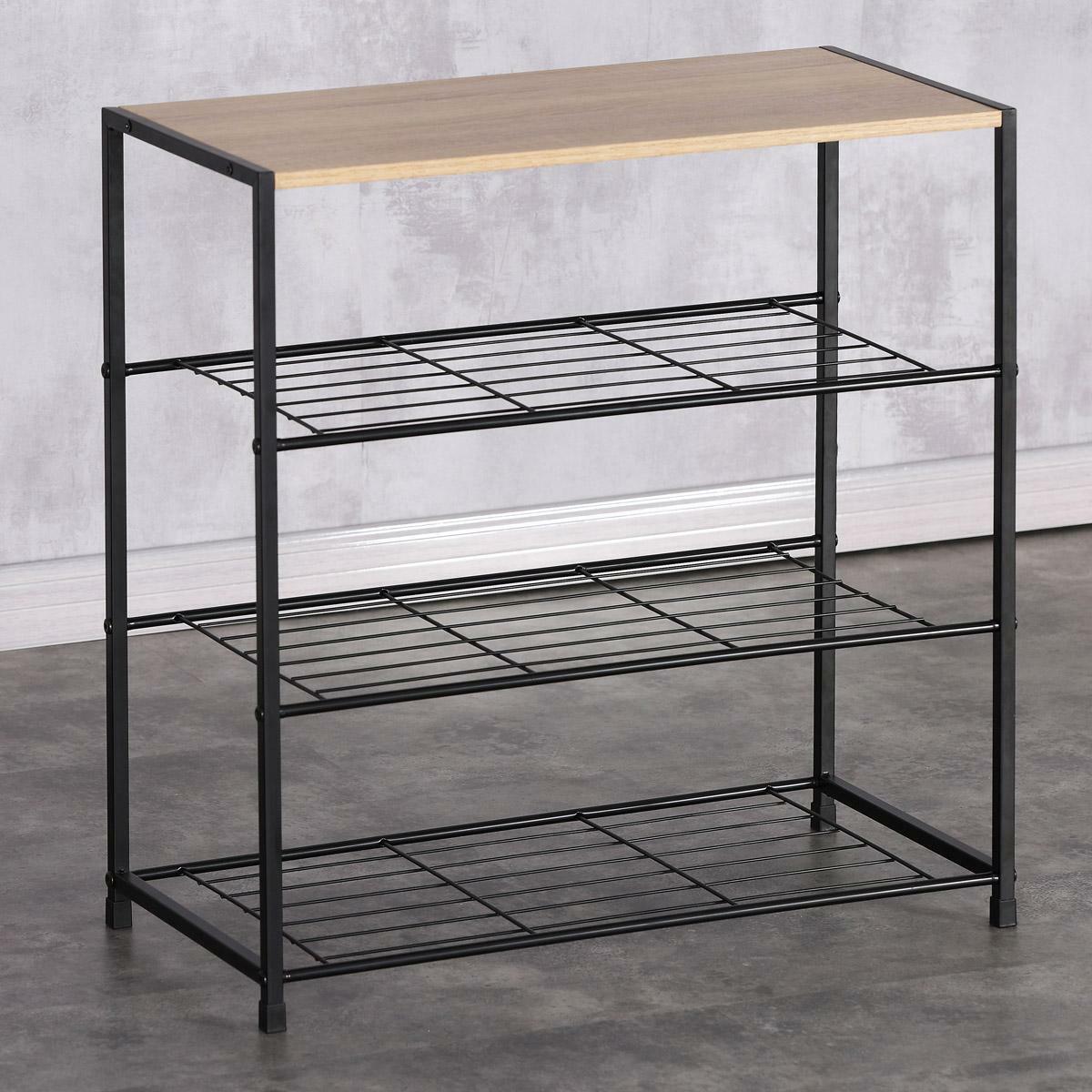 Botník s konstrukcí a odkládacími plochami z lehkého kovu v černé barvě. Půda je vyrobena z MDF desky s povrchovou úpravou 3D fólie v odstínu dub sonoma.