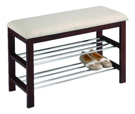 Elegantní lavičku do předsíně spojují tři kvalitní materiály. Konstrukce je ze dřeva barevného provedení dřeva wenge. Na ní se nachází čalouněný sedák z kvalitní ekokůže béžové barvy. Na odložení bot slouží dvě poličky tvořeny čtyřmi kovovými tyčkami v barvě chromu.