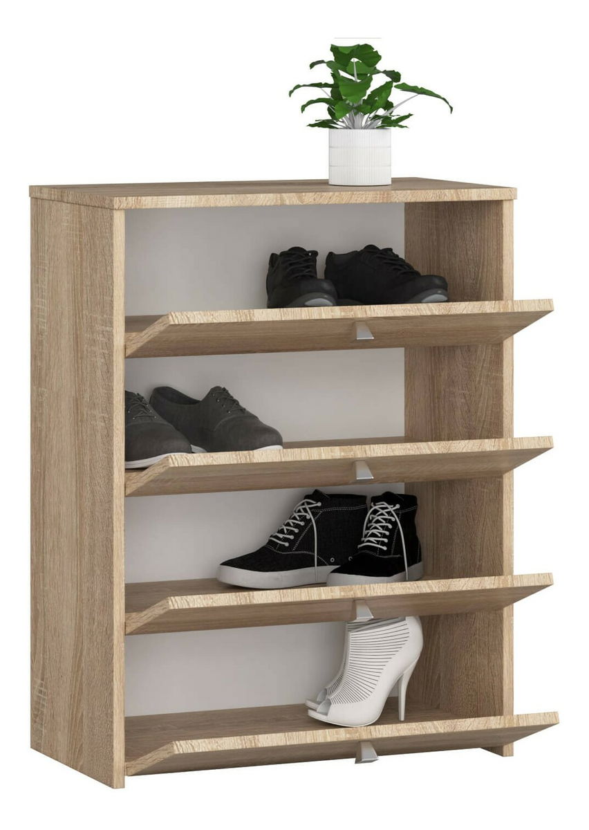 ZobrazitSkříňka na boty Meher má čtyři prostorné police a funkční pantová dvířka s pohodlnými úchyty. Nábytek nezabere mnoho místa a je proto vhodný k umístění nejen do prostorné předsíně, ale také do chodby s malou plochou. Skříňka na boty je velmi praktickým řešením, které výrazně usnadňuje udržování pořádku v předsíni. Klasický nábytek působí efektně v kombinaci se světlými i tmavšími stěnami či podlahami. Botník se bude skvěle vyjímat i ve slabě osvětlené nebo neobvykle úzké místnosti, opticky ji prosvětlí a rozšíří. Ve skříňce můžete uložit nejen boty, ale také příslušenství pro jejich čištění. Vrch nábytku lze využít jako praktický volný prostor, například k odložení kabelky či aktovky po příchodu domů, nebo jako místo pro dekorační prvky interiéru. Skříňka na uložení bot je vyrobena z odolné laminované desky a je pečlivě ukončena hranami z ABS dýhy.