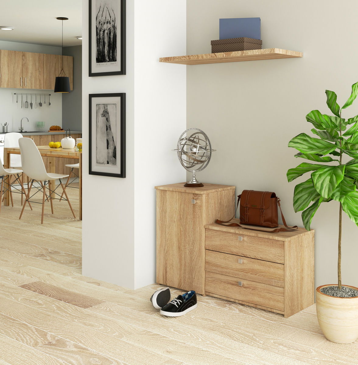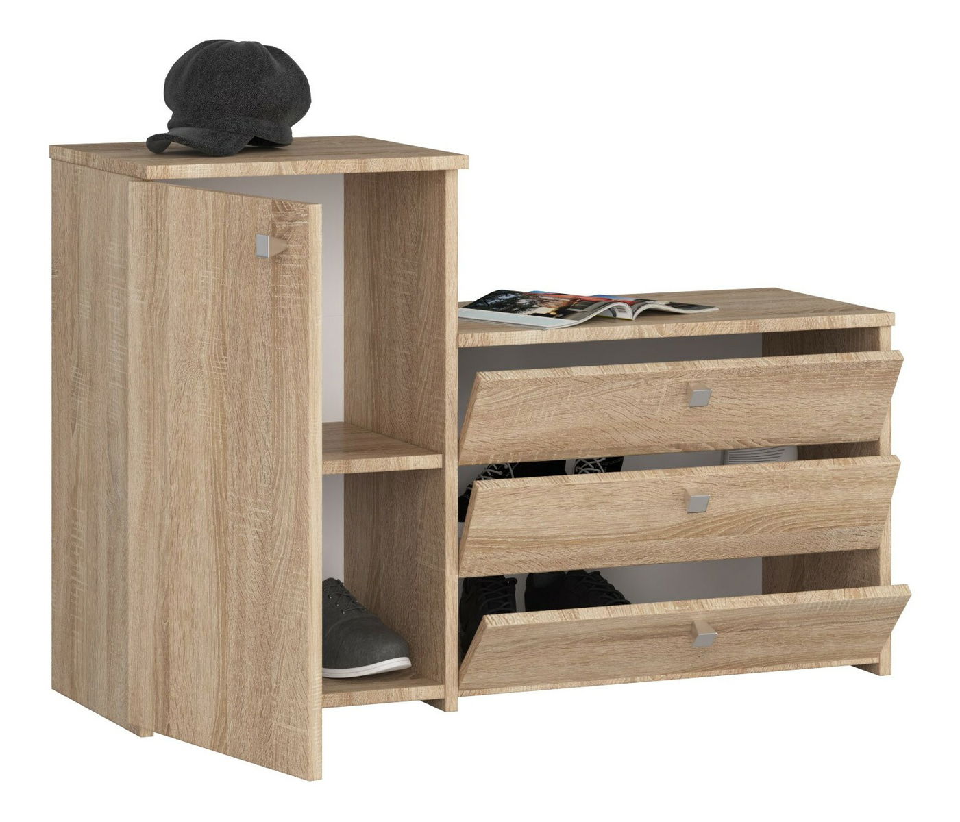 ZobrazitPokud jste ve stádiu zařizování si předsíně a hledáte solidně vyrobený nábytek v klasickém provedení, který zároveň také zajišťuje funkčnost a šetří místo, tak skříňka na boty Sirocco bude ta pravá. Skládá se ze dvou částí - otevírá se dvířky, včetně dvou polic a tří šuplíků na boty. Díky tomu se do skříňky vejdou všechny předměty potřebné v předsíni - nejen boty, ale také čepice, šály a rukavice. Za pozornost stojí cena skříňky a její solidní zpracování. Nábytek se výborně kombinuje s ostatními výrobky z této kolekce. Díky tomu si budete moci zařídit působivou a funkční místnost, která splní očekávání i těch nejnáročnějších zákazníků našeho internetového obchodu. Skříňka na boty je vyrobena z laminované desky o tloušťce 16 mm. Viditelné hrany jsou pokryty ABS dýhou zvyšující odolnost proti poškození.