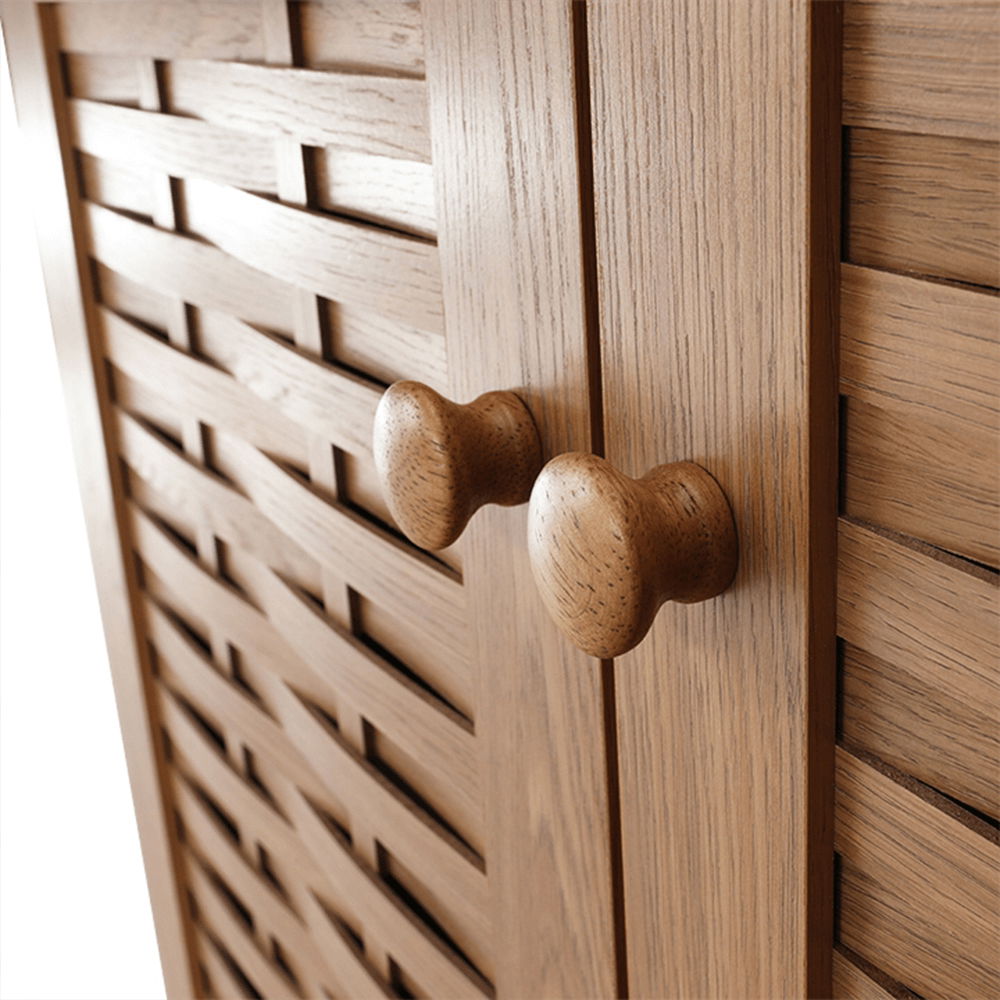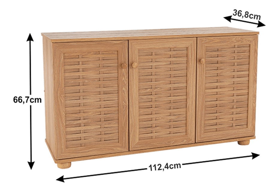 Tento botník se třemi dvířky a provedením natural je vyroben z MDF laminované desky a masivu. Jeho rozměry jsou 112,4 x 36,8 x 66,7 cm. Botník je dodáván v demontu, a je ideální pro pořádání vaší obuvi.
