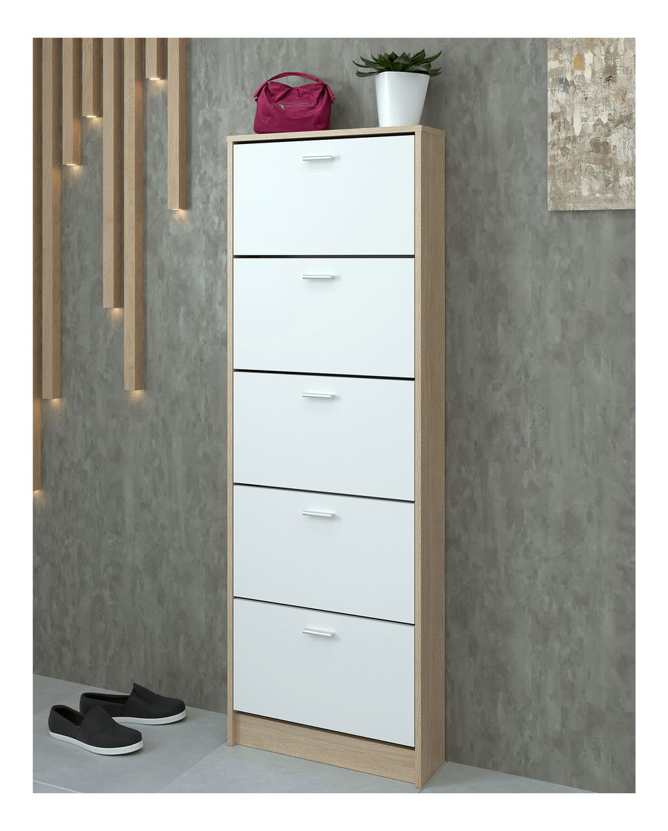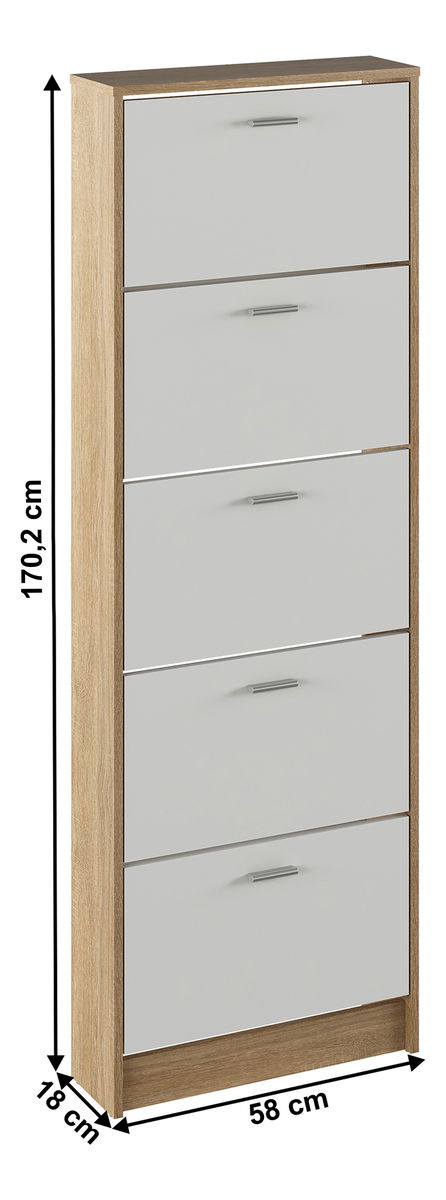 Botník Mobby 15 je ideálním řešením pro váš neustálý problém s uskladněním bot. Tato skříňka na boty je vysoká 170.2 cm, široká 58 cm a hluboká 18 cm. Je vyrobena z laminované dřevotřísky, která kombinuje barevné tóny dub sonoma a bílá. S pěti výklopnými šuplíky poskytuje dostatek úložného prostoru pro vaše boty. S praktickým botníkem Mobby 15 bude vaše předsíň uspořádána a organizována, a dodá jí nový a stylový vzhled.