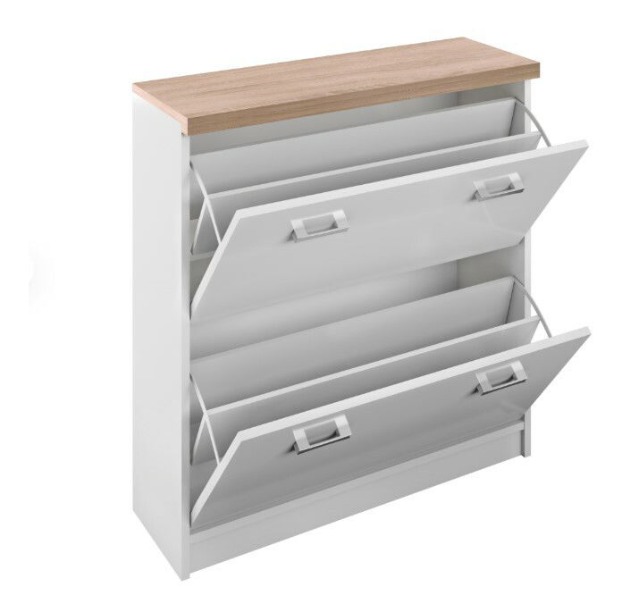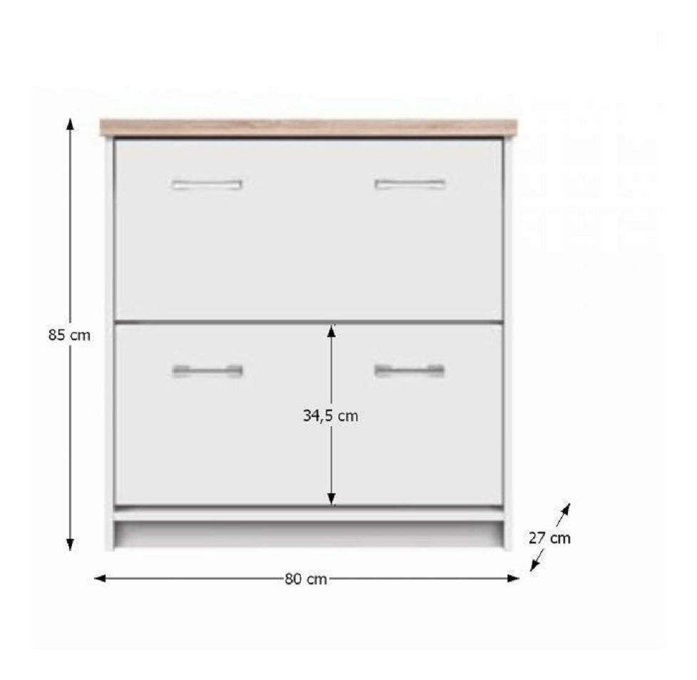 Botník Timmy Typ 11 2K je skříňka na boty s bílým a dubovým sonoma provedením. Je vyroben z DTD laminovaného materiálu a jeho rozměry jsou 80x27x85 cm. Korpus má tloušťku 16 mm a vrchní deska 32 mm. Botník se dodává v demontu.