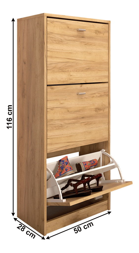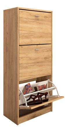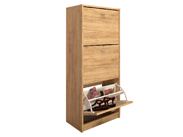 Botník Verity TYP 2 je třířadý. Vyrobeno z kvalitní dřevotřísky DTD laminované v provedení artisan. Lehce zapadne do každé předsíně. Výklopný botník je určen pro boty a denní maličkosti. Do botníku můžete jednoduše uložit velké i malé boty, a tím si udělat prostor při vstupu do domácnosti. Jednoduchý design skrývá v sobě praktičnost a funkčnost.
