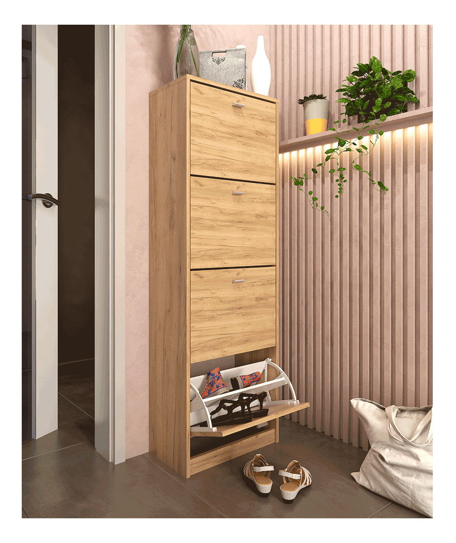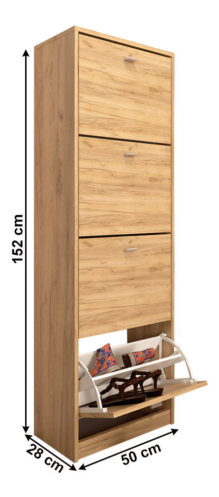Botník VERITY TYP 3 je čtyřřadý botník vhodný na boty. Výška 152 cm, šířka 50 cm, a hloubka 28 cm. Bílá barva krásně doplňuje odstín dřeva sonoma. Díky výklopnému designu lze snadno uložit velké i malé boty, čímž se uvolní prostor při vstupu do domácnosti. Jednoduchý design skrývá v sobě praktičnost a funkčnost.