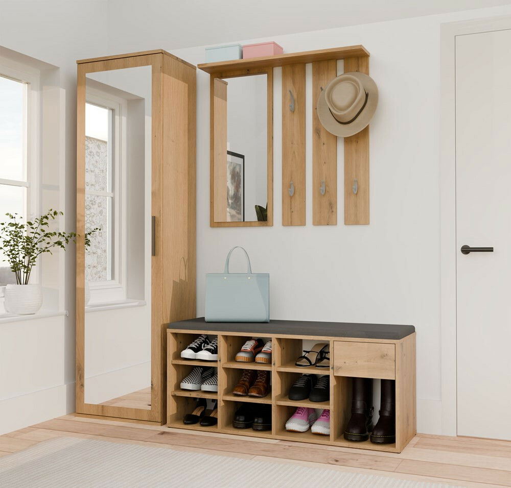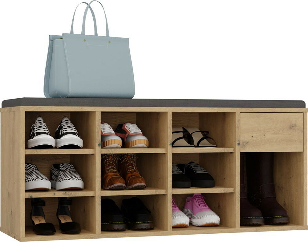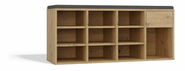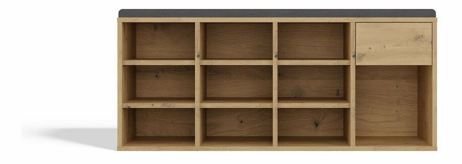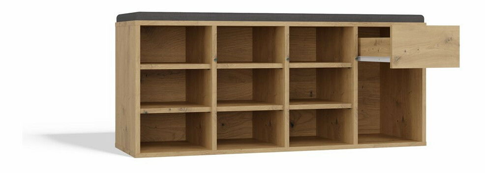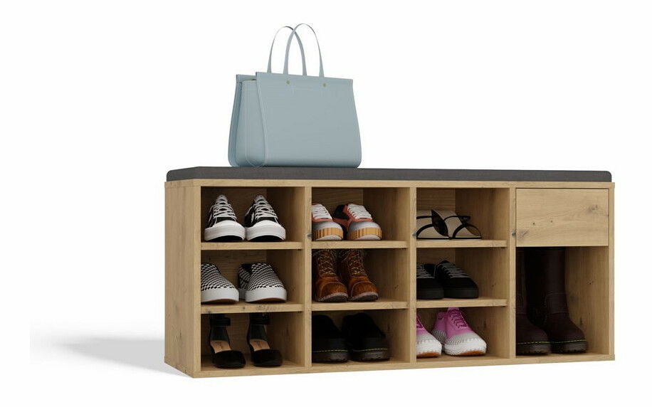 Botník Telos 1 je praktický a stylový nábytek, který se skvěle hodí do každého předsíně. S elegantním a teplým dekorem v odstínu dub artisan nabízí nejen moderní vzhled, ale také vysokou funkčnost. Tento botník disponuje devíti prostornými přihrádkami na obuv, praktickým šuplíkem na drobnosti a vysokou boční komorou, ideální na kozaky či tašky. Na vrchu se nachází měkké tapicerované sezení, které zajišťuje pohodlí při obouvání. Telos 1 je skvělou volbou pro organizaci a estetiku vašeho interiéru.