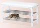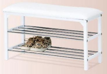 Botník s bočními prvky konstrukce v provedení bílá barva (prášková) a dvěma kovovými poličkami v provedení chromová barva. Botník je vybaven komfortním čalouněným sedákem z bílé koženky.