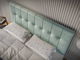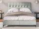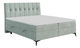 ZobrazitElegantní manželská postel typu boxspring na vyšších nožičkách v jemném pastelovém mátovém odstínu. Manželská postel se skládá ze dvou samostatných lůžek, které lze vyklopit z boční strany. Po zvednutí matrací se zjeví úložný prostor na každé straně. Postel stojí na vyšších (13 cm) šedých kovových nožičkách. Na pružinových matracích je položen jeden velký topper. Víceúrovňová konstrukce je vysoká 53 cm. Vnitřek postele je z bílé desky o tloušťce 16 mm. Čelo postele je polstrované 3 cm široké a prošívané svisle čarami s 20 centimertovými rozestupy.