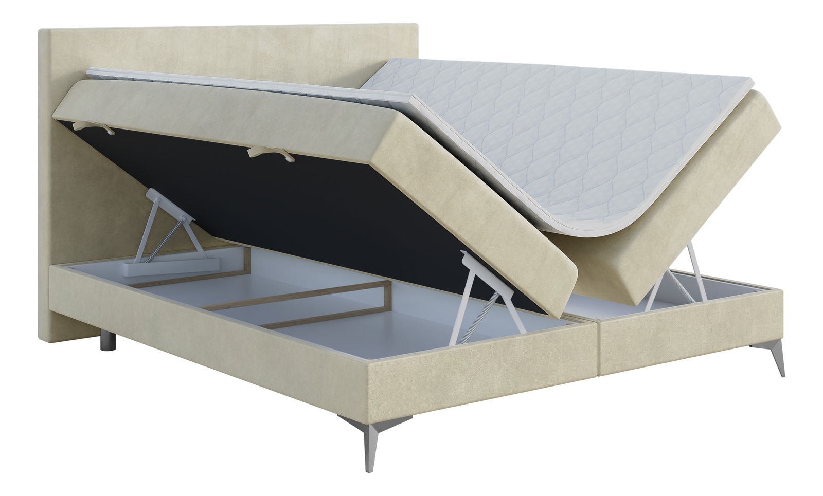 ZobrazitJednoduchá manželská postel typu boxspring v příjemné neutrální barvě se hodí do každé jedné ložnice. Manželská postel se skládá ze dvou samostatných lůžek, které lze vyklopit z boční strany. Po zvednutí matrací se zjeví úložný prostor na každé straně. Postel stojí na vyšších (13 cm) šedých kovových nožičkách. Na pružinových matracích je položen jeden velký topper. Víceúrovňová konstrukce je vysoká 53 cm. Vnitřek postele je z bílé desky o tloušťce 16 mm. Čelo postele je hladké bez prošívání.