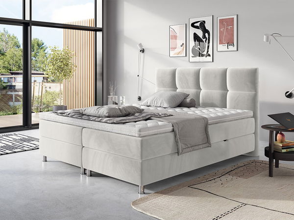 Hledáte stylovou a módní postel, která bude fungovat v moderní ložnici? Máme pro vás skvělou nabídku! Kontinentální postel Andromeda. Tento model se vyznačuje komplexní strukturou, která nabízí zdola: dvouskříňový kontejner na podestýlku s bočním otevíráním. - pružinová matrace - bonnell, zapuštěná do rámu postele. Matrace poskytuje správnou oporu páteři během spánku. - topper matrace - topper, je to vrstva pěny, která je zodpovědná za pohodlí a komfort. Potah je prošívaný a má klimatizační vlákno. Celek doplňuje vzhled postele, jehož základem je čalouněné ozdobné čelo a nohy v barvě chromu.