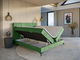 Postel pro odvážné s velkými knoflíčky na jejím čele. Barva postele je v netradiční zelené barvě. Čelo postele je působivě prošívané na šest částí. Spoj v prošívání je doplněn o velký dekorační knoflík o průměru 5 cm. Manželská postel se skládá ze dvou samostatných lůžek, které lze vyklopit z boční strany. Po zvednutí matrací se zjeví úložný prostor na každé straně. Postel stojí na vyšších (13 cm) šedých kovových nožičkách. Na pružinových matracích je položen jeden velký topper. Víceúrovňová konstrukce je vysoká 53 cm. Vnitřek postele je z bílé desky o tloušťce 16 mm.