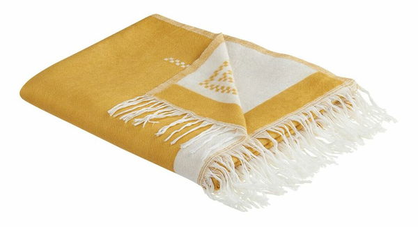 Pokud hledáte hřejivý a příjemný doplněk do interiéru, tato přikrývka bude výbornou volbou. Je vyrobena z akrylu a polyesteru v nádherné žluté barvě, díky které rozzáří jakoukoli místnost. Zajímavý geometrický vzor a ozdobné bílé třásně vnesou do vašeho interiéru styl.