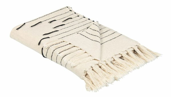 Doplňte svůj obývací pokoj nebo ložnici touto ručně vyrobenou bavlněnou dekou, která zkrášlí zařízení celé místnosti. Deku zdobí pruhovaný vzor v černé barvě a dekorativní třásně na obou koncích, díky kterým zaujme a upoutá pozornost. Jelikož byla vyrobena ručně, žádná jiná deka není stejná, takže váš domov bude zdobit jedinečný kousek.